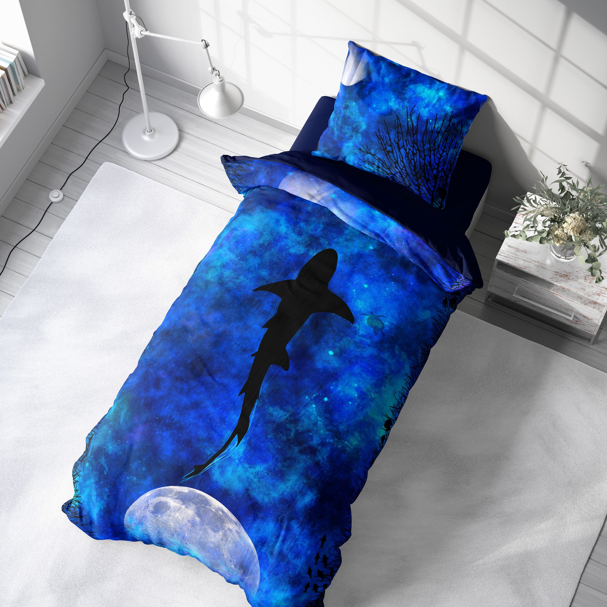 La colección "Libertad" de Lórien Art Designs representa la libertad más pura a través de la metáfora del tiburón, símbolo de inmensidad, intuición e instintos. Tonos azules intensos y un fondo cósmico representan a un ser que se desliza por las oscuras pero ilimitadas capas de la naturaleza, emprendiendo un viaje sin límites. Este diseño refleja un viaje humano hacia su propio mundo interior; una búsqueda de libertad libre de pertenencias y expectativas, guiada completamente por la intuición.
