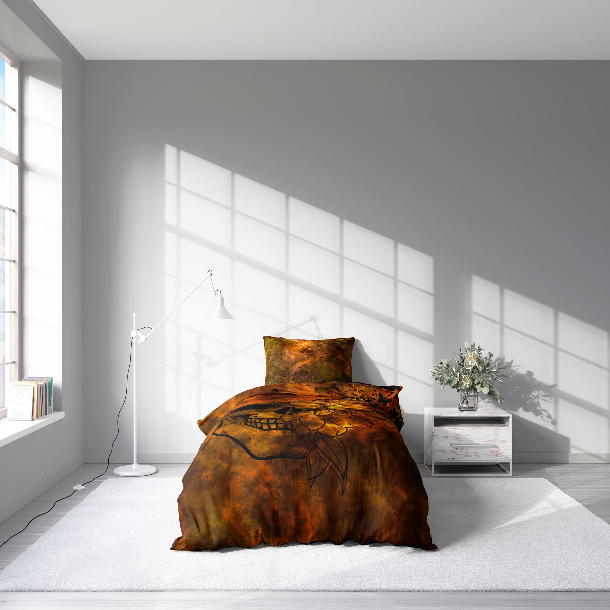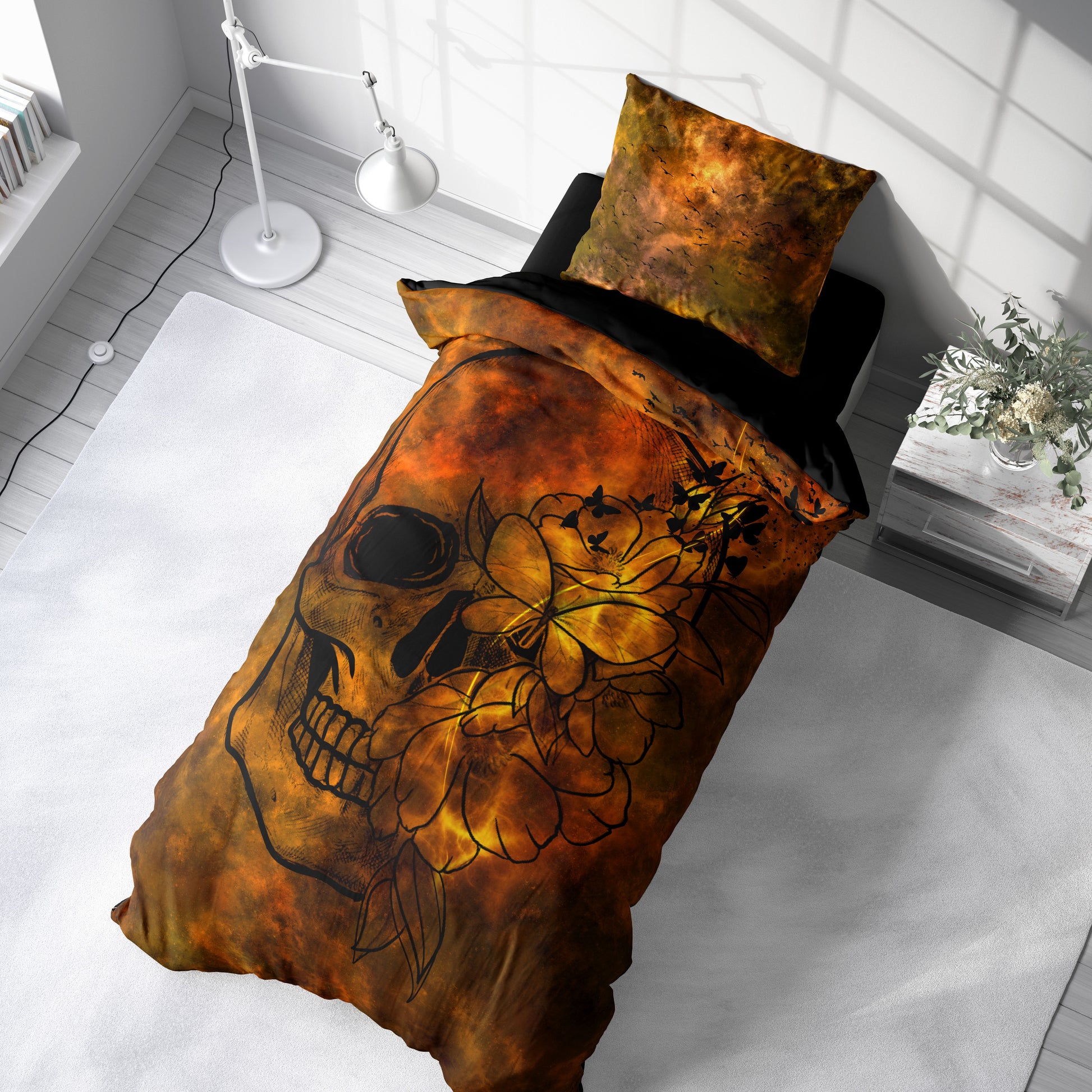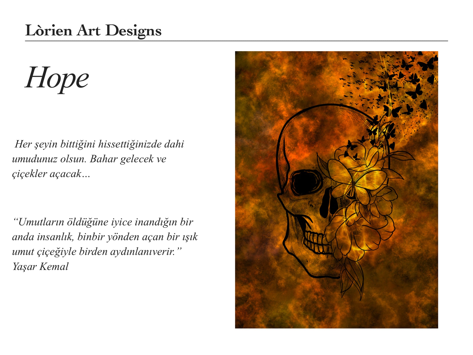 La colección "Esperanza" de Lórien Art Designs presenta una historia única donde la oscuridad y la luz se entrelazan. Motivos de calaveras y flores, sobre un fondo adornado con los colores de la tierra en llamas, representan la vida al borde de la muerte; el principio que sigue al final. Flores que brotan del interior de una calavera descolorida y mariposas que se elevan simbolizan la primavera que sigue a la destrucción. Está diseñada para que despiertes cada mañana con una nueva esperanza que emerge de las cenizas.