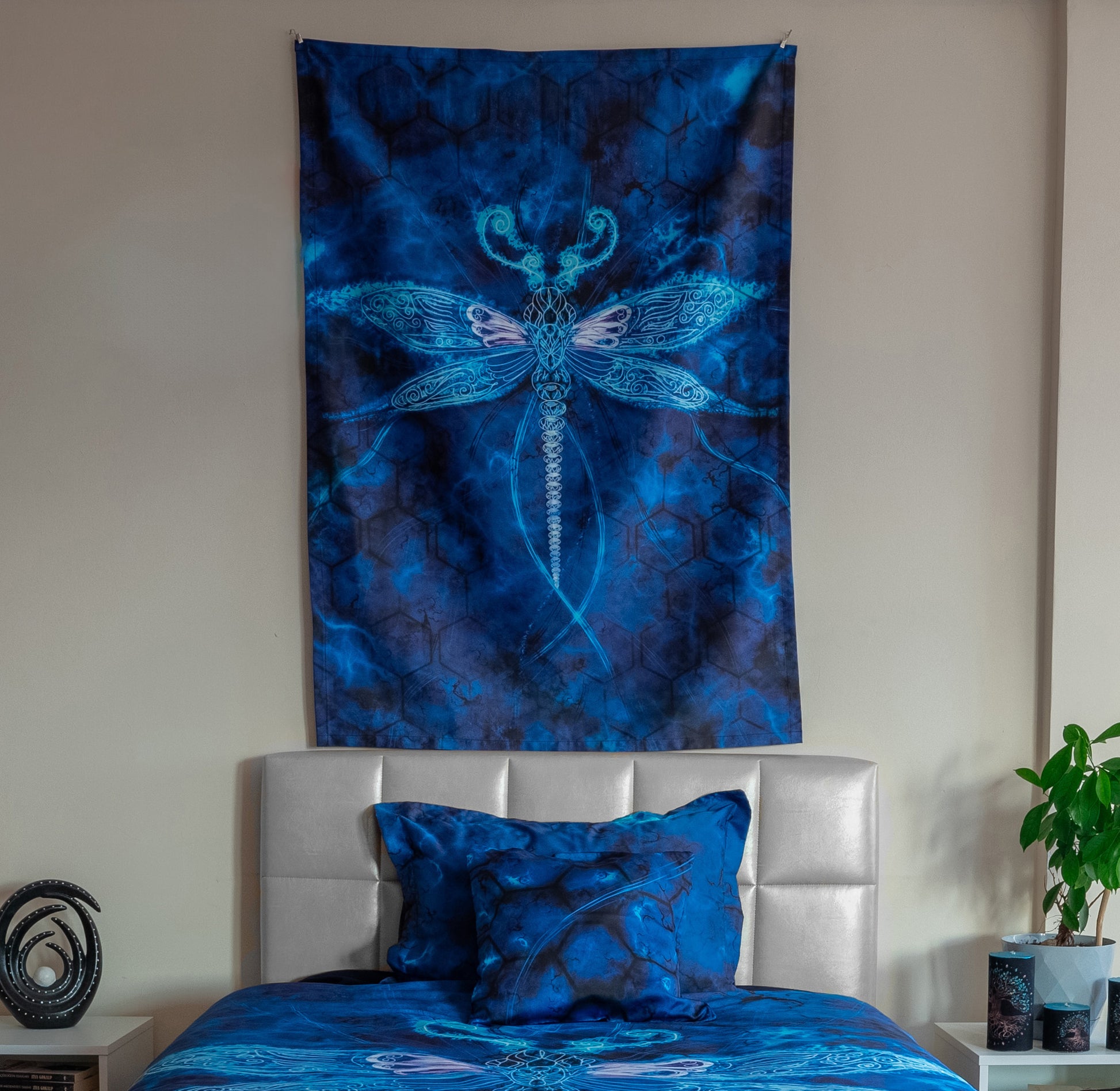 El tapiz colgante Wisdom, con sus tonos azul intenso y la figura central de una libélula, aporta un ambiente tranquilo, equilibrado y moderno a los espacios. Gracias a su textura fluida y composición sencilla, combina con diferentes estilos de decoración.