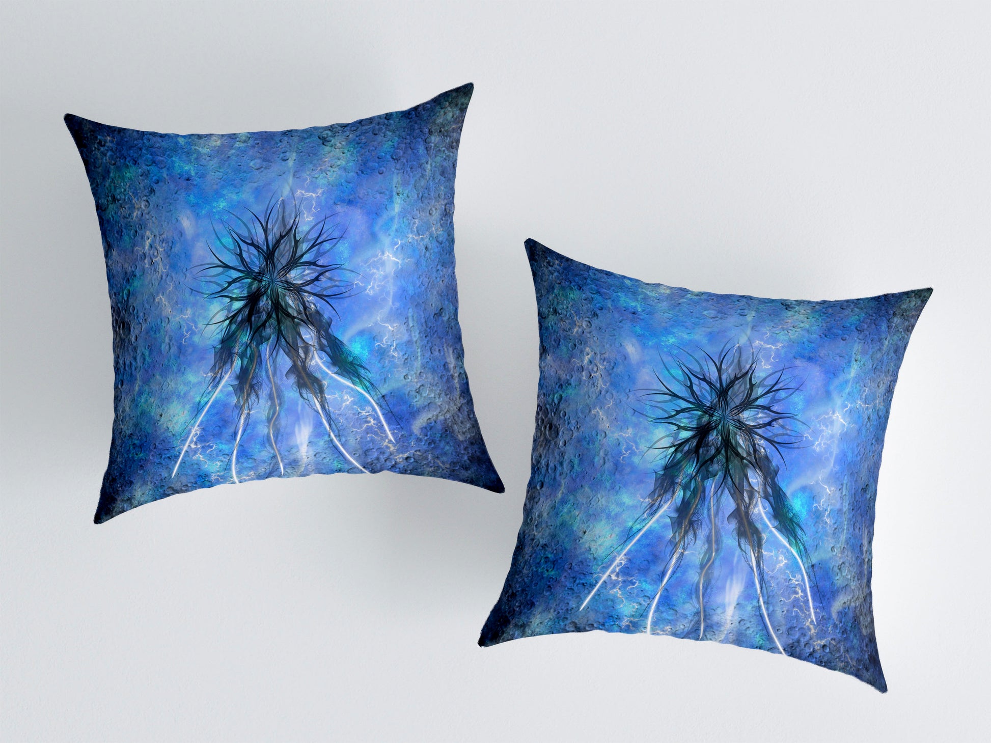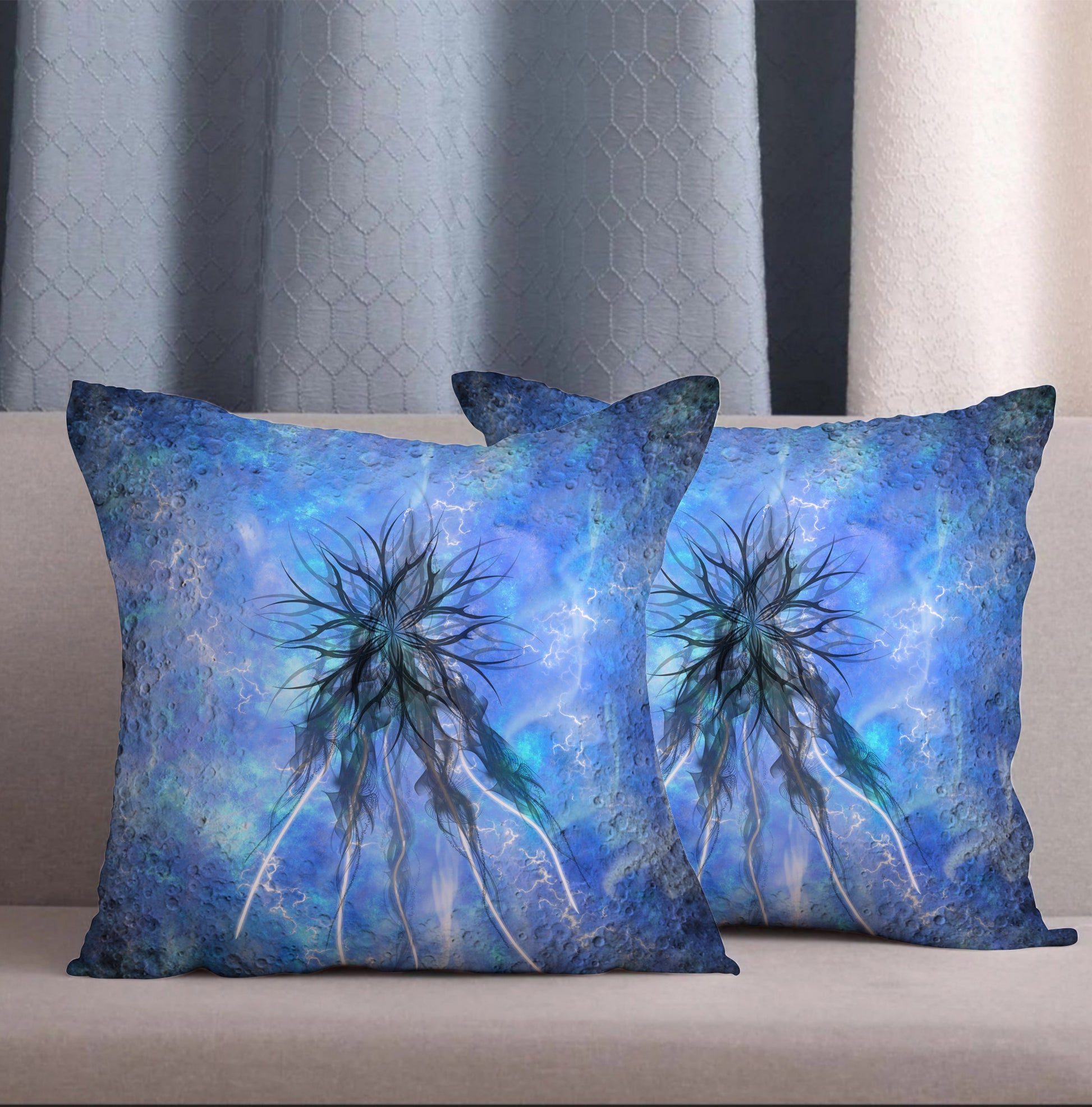 Imagine İkili Kırlent Kılıfı Seti, hayal gücünün sınır tanımayan doğasından ilham alan soyut bir tasarımı yaşam alanlarına taşır. Kozmik mavi tonlar içinde filizlenen form, düşüncenin kök salmasını, hayalin derinliklere doğru yayılmasını simgeler.